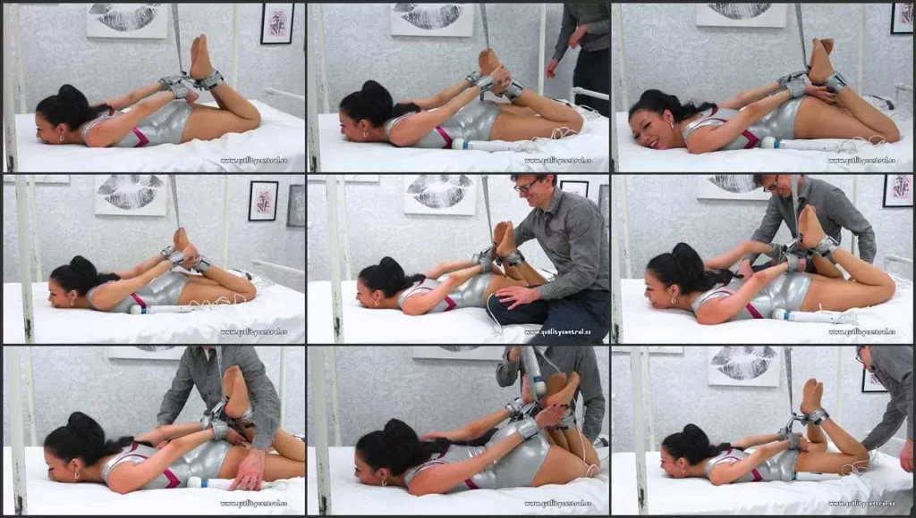 A simple yet effective hogtie for resident brat Mia (who by the way is coming back for another trip, so watch out). With your wrists and ankles cutely tied, what are you going to do, bite your way out of this?