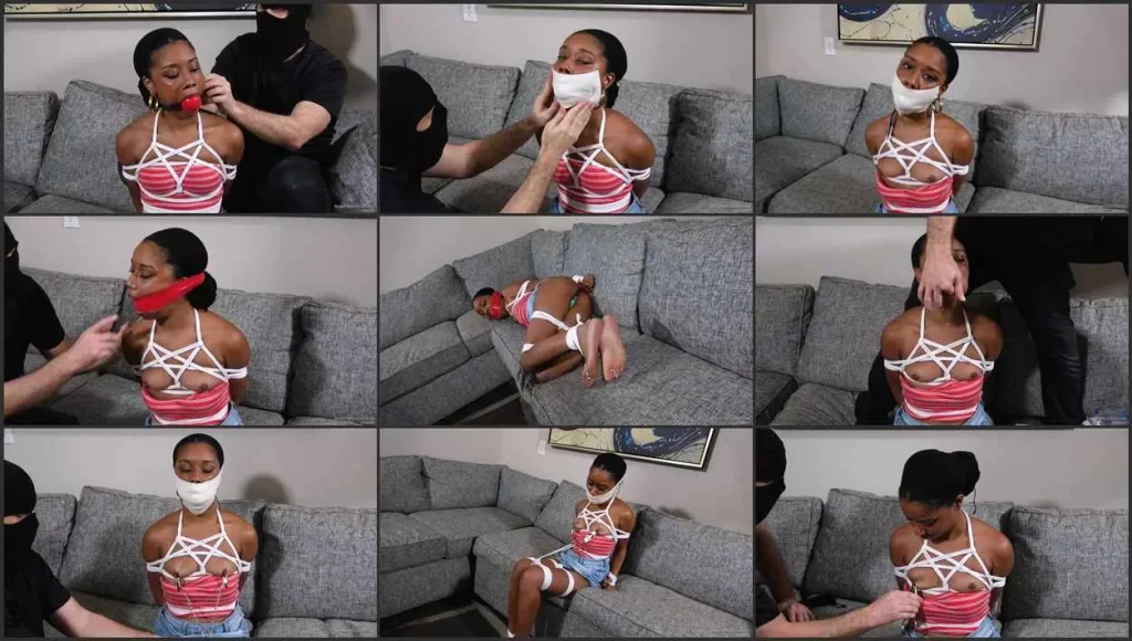 A nylon stocking is packed into each of Nene’s cheeks and a big red 2.25-inch ball gag is buckled between her lips. A bit later, a 4-inch strip of microfoam tape is put over the ball gag.