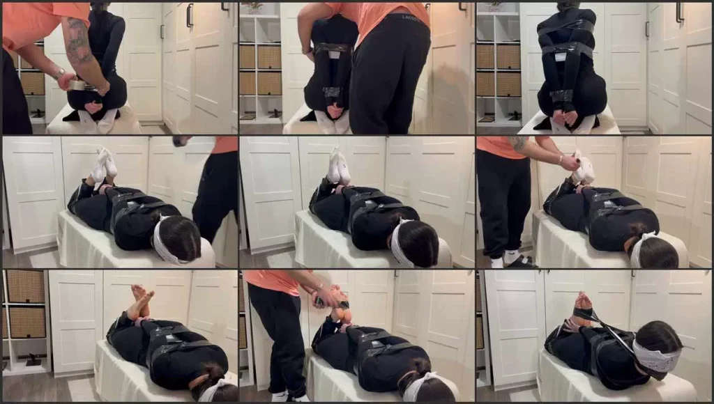 Bound in a super tight hogtie with black tape. Gagged with a sock and tape. Later he secures my head with my bare feet. Don’t my soles look perfect? He also tickle me.