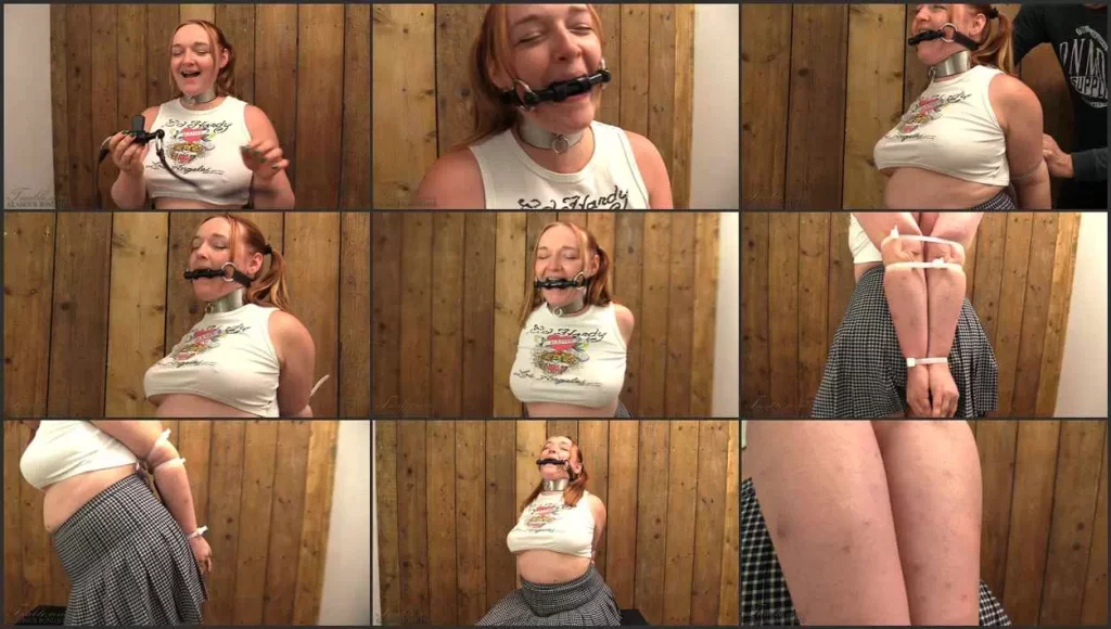 Kerry is back! Can she still do elbow bondage? Of course she can!! I ziptied her elbows together, it was extremely tight! Kerry loves tight bondage, so don’t worry! The gag was a bigger challenge! It is a tongue port gag. With a tongue suppressor very far into Kerry’s mouth, it takes skill and concentration to keep a gag reflex down. It also makes Kerry drool uncontrollably, rivers of drool!! Nothing she can do about that with her arms pinned behind her back!