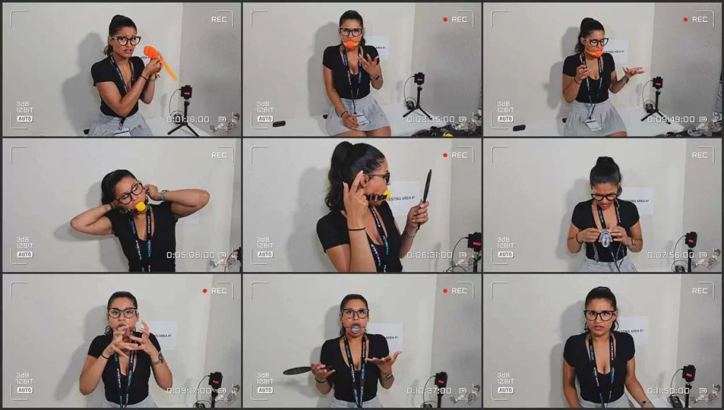 Turns out, they’re all tongue trapper gags—designed to lock my tongue in place and leave my mouth helpless and drooling. One by one, I try them on for “research” purposes while speaking to the camera like I’m reporting back to the test administrator (that’s you).