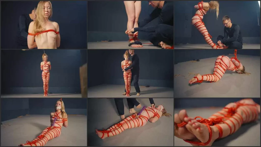 Ann is about to try a very tight bondage with many ropes. She is a little nervous, but submissively surrenders to the process. Kalahari puts round after round on Ann’s naked body until he completely restricts her. He even ties her feet and toes, so that it is difficult for her to stand, and she has to jump on the spot. Kalahari even ties her hair and makes a tape gag. Ann tries to find her balance, while Kalahari spanks her and groping her entire tied body.