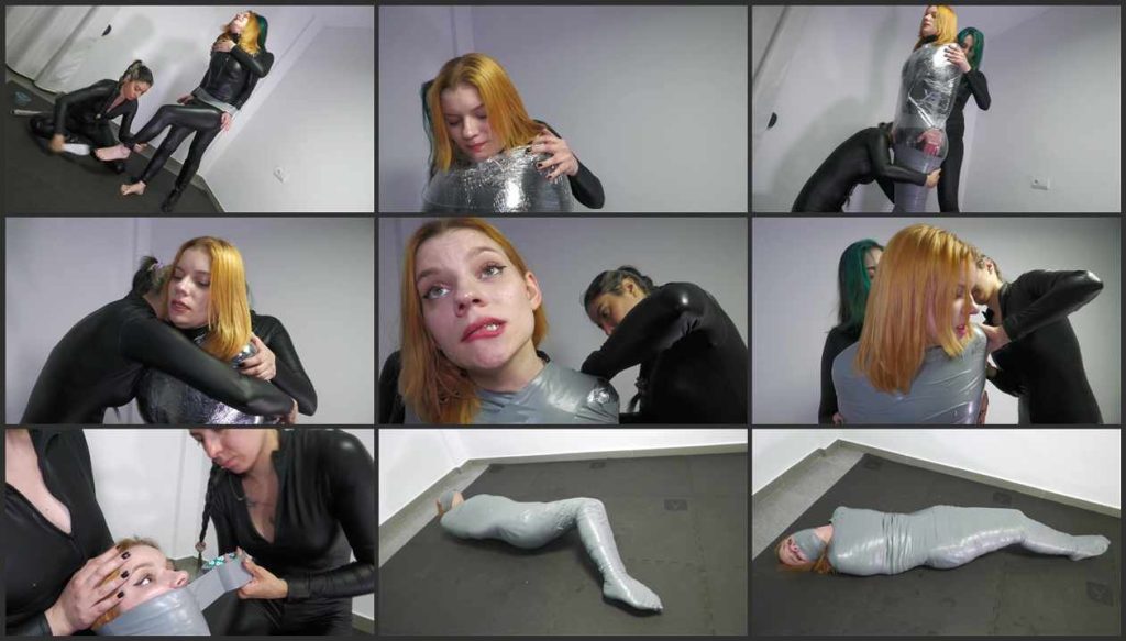 They decide to set a trap for her in an isolated building, where they can catch her and leave her there. Shelvy goes there, expecting to find some very rare jewels. Unfortunately, once at place, her two rivals fall on her and mummify her so that she has no way out! First they tie each one of her hands individually to her body. They remove her boots and socks, and then mummify her with transparent film. Then they also mummify her with tape. Shevyl tries to free herself and convince them to work together, but doesn’t succeed. The two burglars put her her on the ground, wrapped from toes to shoulders, and finally gag her. They put her socks into her mouth and gag her with a big tapegag. They take some selfies with their victim to humiliate her. Then they leave and Shelvy is left there tied up and gagged, totally helpless! Can our super catburglar escape this time?