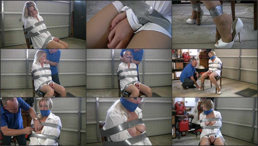 Given her always animated, witty, and vivacious nature, I figured sticking Whitney in a crummy place first thing would bring her to a quick boil. It did. Our usual sunny weather was overcast and damp for three days during her trip west. She was pissed about that even before her arrival. The sun was back out today, but I taped her up in the garage anyway. No backyard pool leisure for the new guest just yet. Whitney fights hard against the duct tape immobilizing her in a chair. (Her torso was taped to the chair above and below her breasts before wrapping the tape over her arms and around the chair, ensuring Whitney will never break free). She looks so sexy in a man’s dress shirt, pantyhose, and open toe D’Orsay white high heels. Being Whitney as herself, she never stops talking, using her guile and charm as best she can to get me to cut her out of the tape. What she gets is a mouth full of panties with blue vet wrap cleaving the wad in and then covering her face with multiple wraps around her head (on-screen). She is much quieter now, but still trying to persuade. She does not realize her gag sounds and escape attempts are fueling my libido, thus insuring she will be staying helpless for a long while. I want to see her natural boobs too, so I expose them on screen. She admitted defeat while un-gagged earlier in this presentation. I will wait until she admits defeat while wearing the stifling gag before fetching scissors.