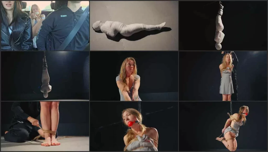 In the hands of these vicious couple, Ann is completely helpless. They take her by car to an abandoned basement, tie her up, and gag her with tape. The tight ropes refuse to budge, and all her attempts to free herself are futile. They treat her roughly, slapping her face and speak ominously. Soon, she’s mummified and suspended by her feet from the ceiling! She hangs there alone for a long time, trying to break free from the mummification and making sounds, hoping that someone will finally hear her and find her! They send a mummified photo of her to her boyfriend. But no one says how long they’ll have to wait for her release. How long can she hang like this, upside down? Fear and pain drive the girl to the brink of despair. Just when she’s completely lost track of time, the man arrives and mockingly informs her that her boyfriend seems to have abandoned her, and now she will remain his captive forever. He begins to grope and slap her, strip her topless, and tie her unbearably tightly in a hogtie, then suspends her again in this tight bondage for fun. She is hogtied and suspended and there is no chance for mercy for her!