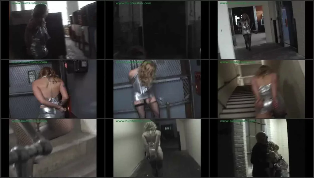 Pretty blond Vivica wakes up cold and in unfamilair surroundings. She tries to get up and finds her hands are locked behind her back in steel handcuffs and tape seals her mouth shut. She reaches up and pulls off the tape and struggles to her feet. She is scared and wonders aloud where she is, why she is dress in such slutty clothes and why is she here? A heavy steel chain hangs from her leather collar clanging as she struggles to walk in uncomfortablely high high heels. She tries to find a way out but all the doors are locked as she struggles to open them with her cuffed hands. She wanders aimlessly confused and lost in the huge complex of warehouse space, halls and stairways. She walks unsteady in riduciously high heels shoes trying too keep her very short tight skirt from riding up her hips. She shivers in the cold looking for a way out or for someone to help her. Will she escape?