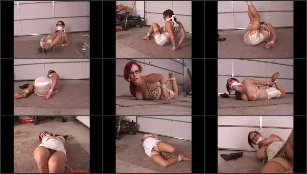 He has Berlin in just her bra, girdle and panties, tied up in a gareg. When she starts to question him and gets too loud, the man gags her. Later, he re-gags her, hoties her and then pulls down her bra.