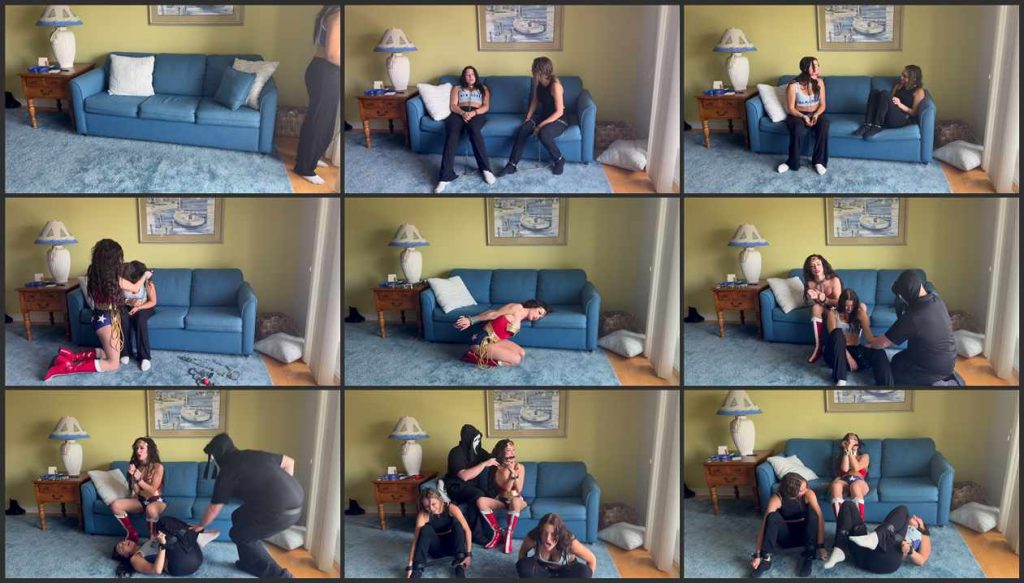 Plunge into the heart-stopping Lair of Restraint, where Blake LaVista, Kloe Love and Ama Rio’s Wonder Woman are ensnared by a cunning villain deep in ancient, crumbling ruins. Blake moves in a sleek, skin-tight black jumpsuit that highlights every motion; Kloe wears rugged cargo pants and a form-fitting tank; Wonder Woman gleams in her star-spangled armor, her golden lasso flickering in the gloom. Tasked by Wonder Woman to investigate a string of disappearances, Blake and Kloe pick their way through echoing stone corridors-until they step on a hidden trigger. A hiss of gas chokes the passage; burning eyes and leaden limbs send them to the floor, unable to move.