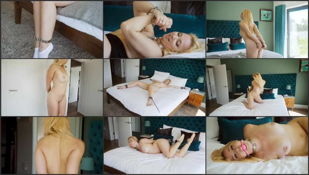 You start by locking her in globe cuffs, with a chain from that to a steel slave collar. Her ankles and shackled in steel too, and you’ve taken off her top so her amazing ample breasts and on full display for you. She’s clearly getting hot under the collar as she gives you a sexy show… but she wants so much more from you! She performs a sexy show in metal bondage on the bed to inspire you to be more implacable and cruel and make her bondage experience so much more.